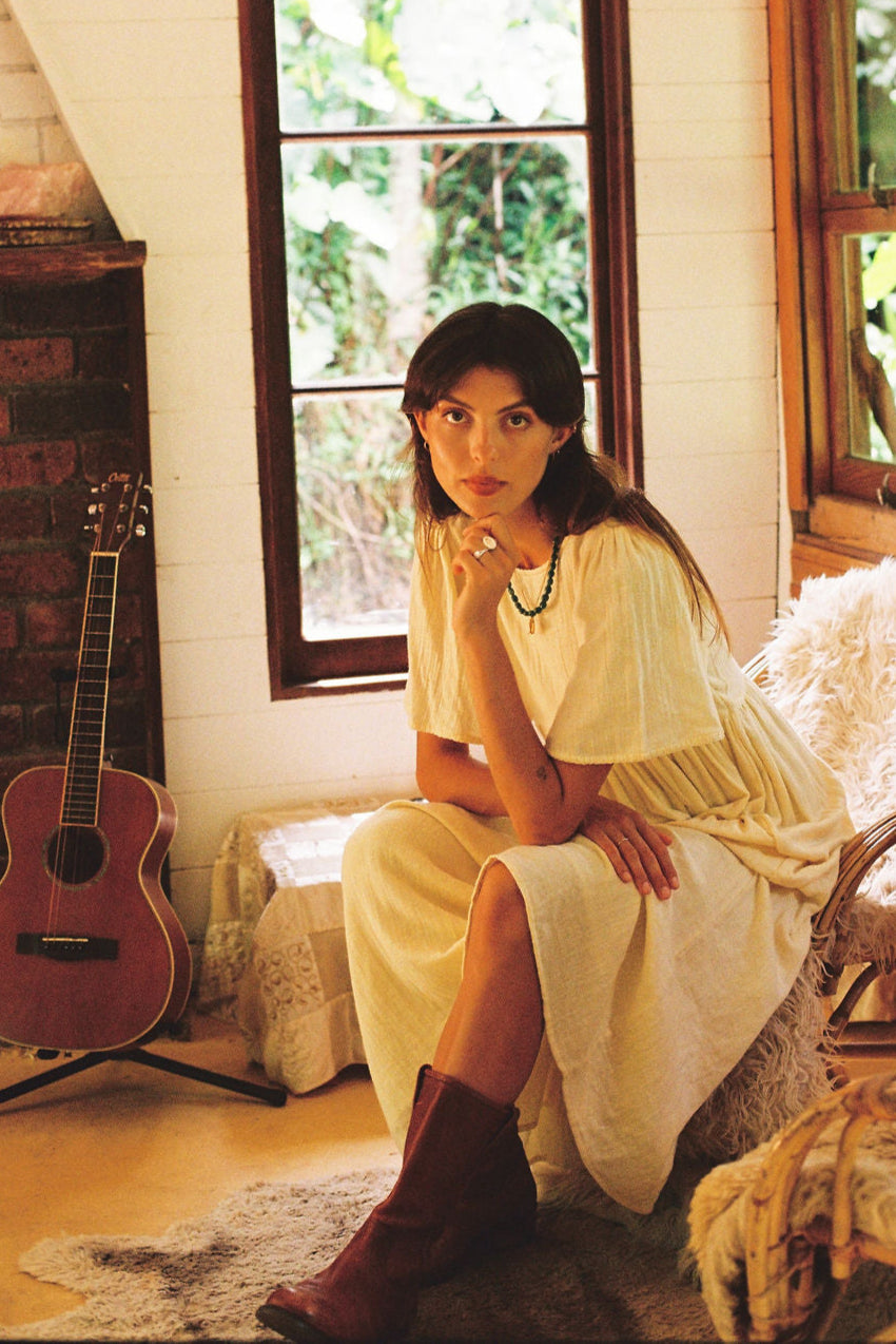 The Amelia Midi Dress returns — a timeless silhouette loved for its effortless femininity. Crafted in a light, creamy cotton gauze, it features a flattering high neckline, delicate hand-stitched blanket details along the edges, and a low back finished with shell buttons. The bust and skirt are softly lined, bringing ease and wearability to this elevated piece