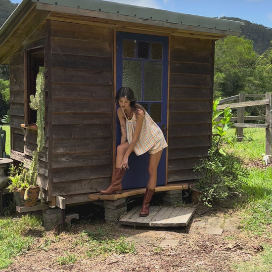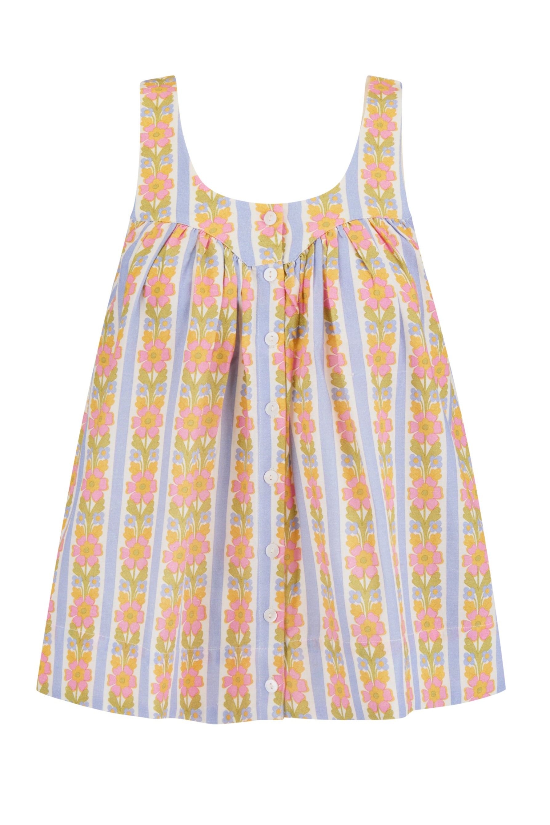 The Celeste Top drifts with the lightness of summer days. Woven in soft cotton and adorned with our in-house floral stripe, its pattern whispers of vintage wallpaper — delicate, nostalgic, and full of charm. A beloved shape in our collection, it’s defined by wide straps, gentle gathers, and a button-through front that falls with effortless ease. Wear it simply with denim or pair it with the matching Celeste Short for a co-ord that feels like a story carried from one sunlit hour to the next.