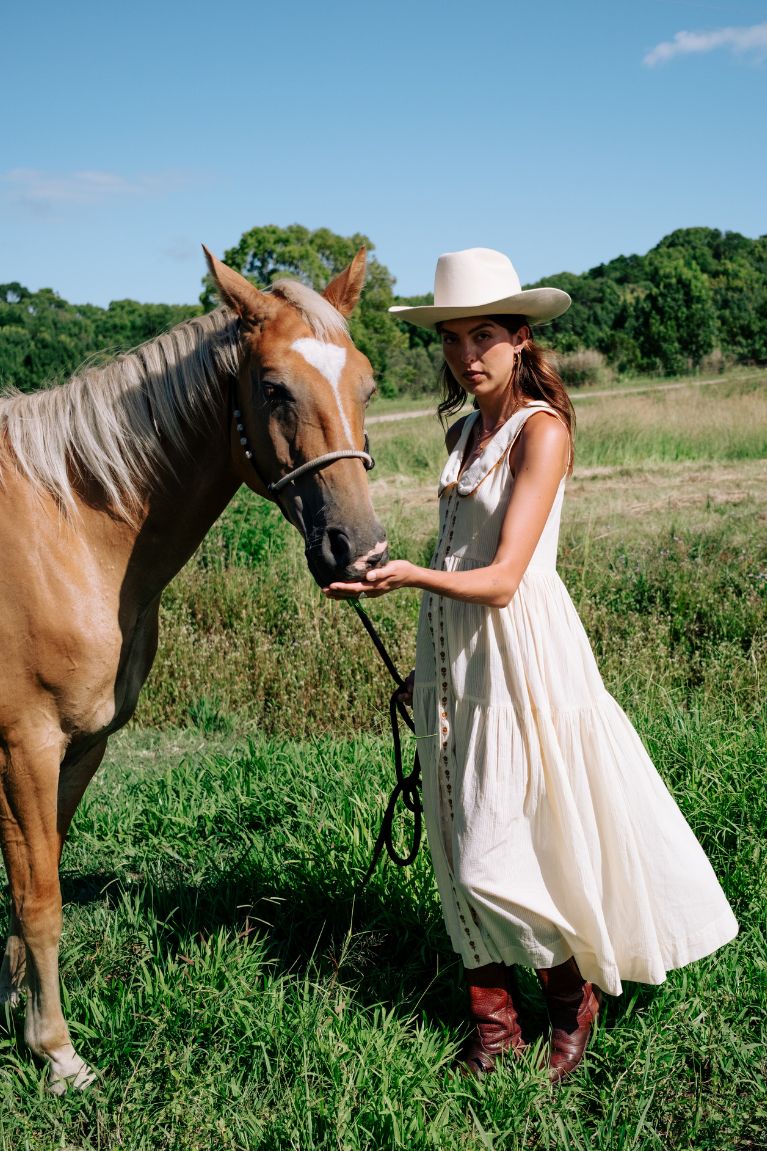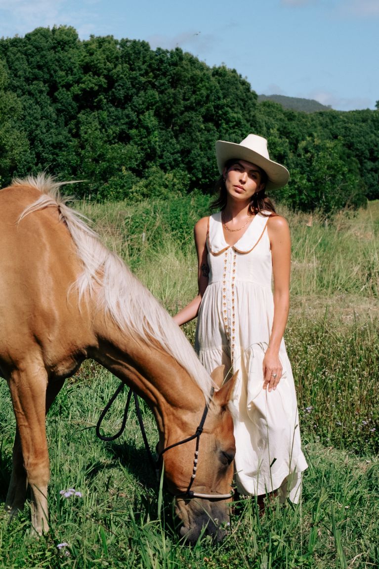 Sunlight in motion, this cream maxi dress carries the same delicate brown daisy embroidery down the front, each accentuated by soft shell buttons and a sweet, trimmed collar. The fitted bodice flatters the waist, before spilling into a tiered, gathered skirt that moves with effortless grace. Sleeveless and airy, it’s light enough to catch every breeze, yet anchored in timeless, vintage-inspired charm.