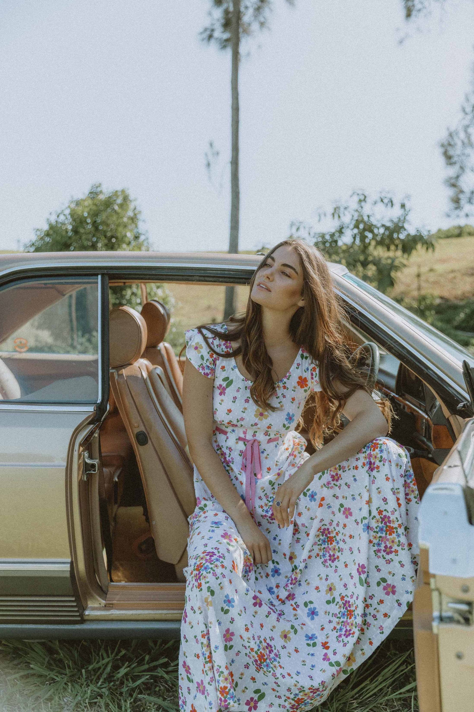 The Melody Maxi Dress features a flattering scoop neckline, shirred back waistband, velvet tape drawstring through front waist, flutter sleeves and is unlined. Hand drawn floral print custom to Marigold Mustang and digitally printed to help reduce our environmental impact.